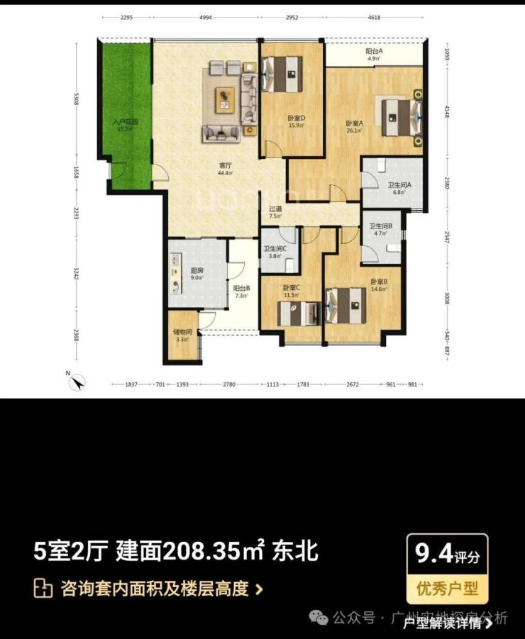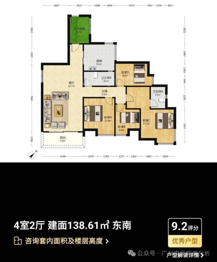 「产品详情」:别墅、叠墅、大平层等全系户型图、主力面积段、实际得房率