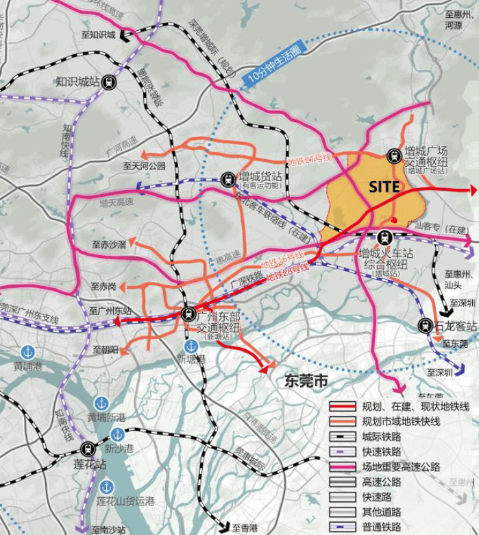 【交通路网】通过广惠高速、华南快速、增天高速(建设中)等快速通达广州市主城区,通过珠三角环线高速等高速公路快速通达深圳市区、深圳机场,实现一小时生活圈。