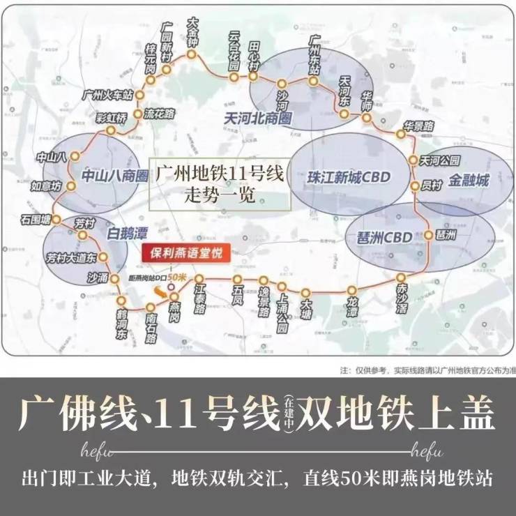 地铁:双地铁上盖,线路四通八达,项目直线50m就是燕岗地铁站。第一广佛线,可以连接佛山新城、千灯湖、荔湾芳村等区域。第二就是11号线,广州首条环线,换乘之王,可以链接全城,均已经开通了。