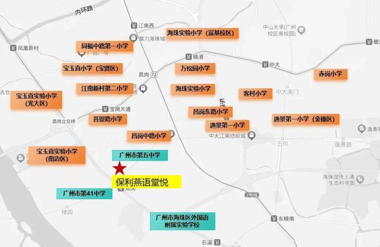 项目1公里范围内还有9所名校环绕:工业大道中小学、广州市第41中学、广州市第5中学、广州昌岗中路小学(翠城校区)、广州市海珠外国语实验中学附属学校、红棉小学(顺意小区)、海富小学、南燕小学、宝玉直小学(南边路校区)等名校。