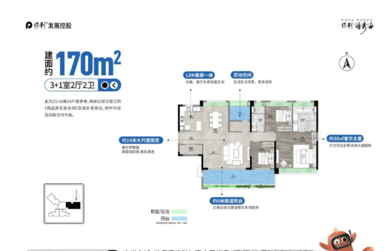 125 平四房两卫,改善型户型,18 方豪华主套,L 型全景飘窗,12 米南向采光;143 平四房两卫,南北对流,约 8.5 米长阳台,西南西望园林,北向看海,主卧 270 度全景飘窗;170 平四房两卫,9 米跑道大阳台,南北对流,正南向看园林,北看海,舒适度与私密性都很好。