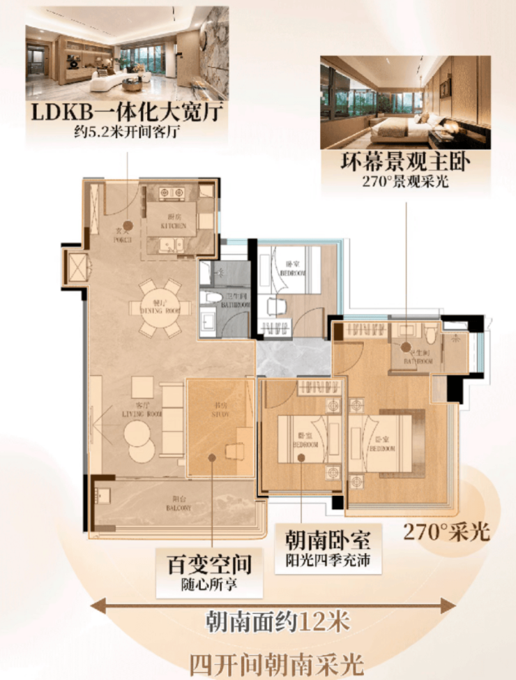 约5.2米开间客厅,LDKB一体化布局,使用功能更灵活,X空间随心而享