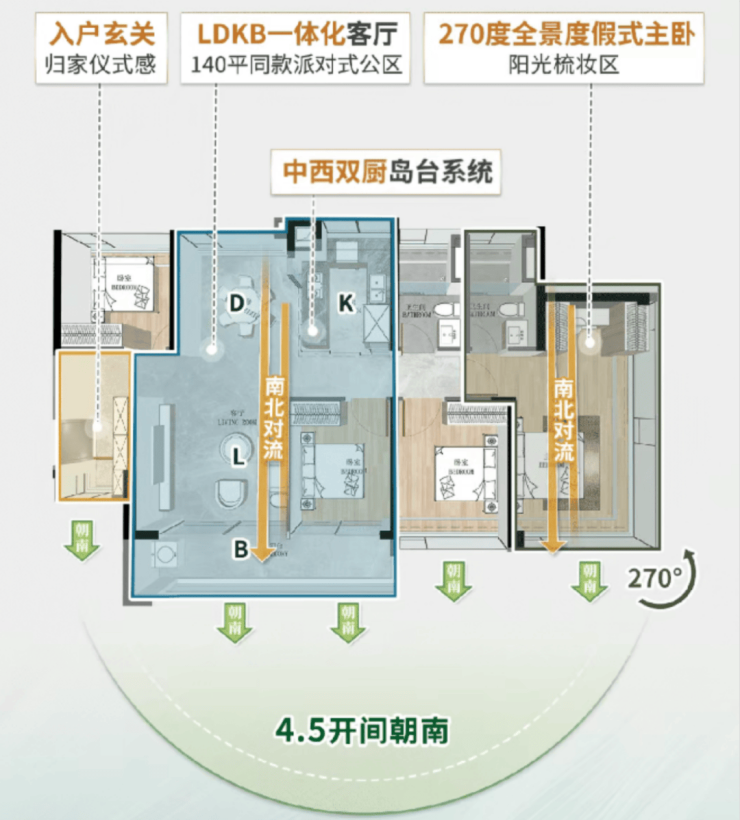 约14.7米南向面宽,餐客厅+主卧均南北通透,清风时时流连