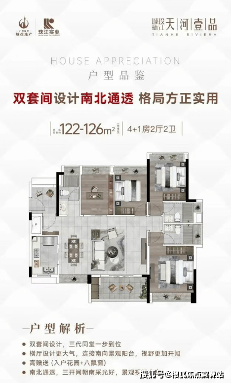 城投珠江·天河壹品推出的户型设计兼顾了实用性和舒适性。例如,96平方米的3+1房户型灵活多变,适合预算有限但追求品质生活的家庭;而120平方米的4+1房户型则为家庭成员较多的家庭提供了充足的空间,南北通透的设计保证了良好的通风和采光;最大的126平方米户型更是配备了更多的卫生间,提升了居住的私密性和便利性。