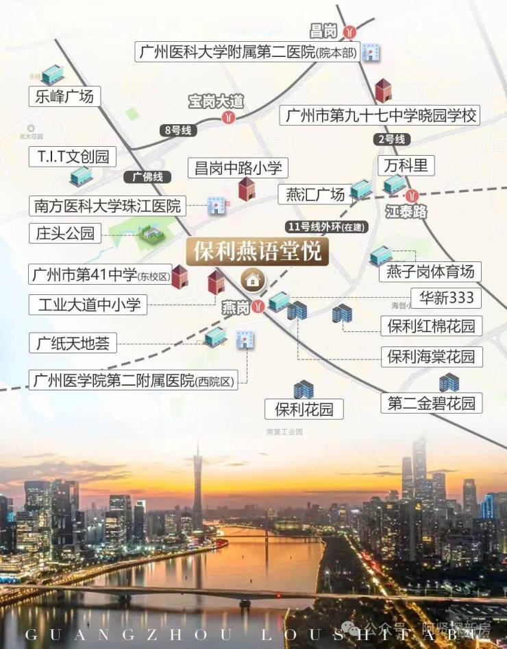 约50m燕岗站,广佛线、11号大环线(土建工程已完成98%,将于年内通车)双地铁上盖,4站达上涌、8站达琶洲,轻松链接全城。
