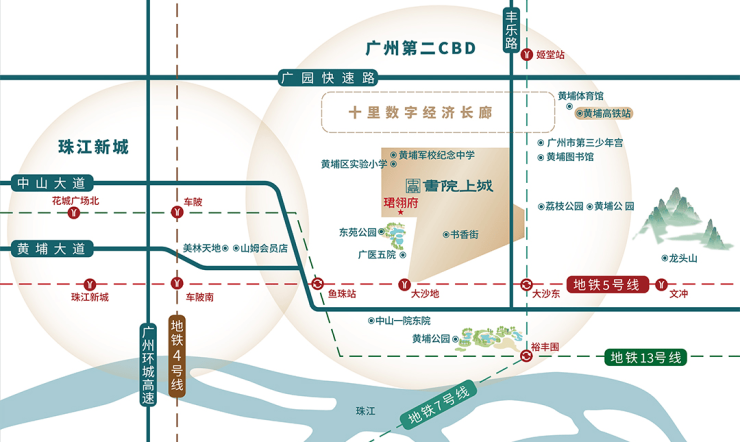 项目距5号线大沙地站仅约600米,2站到三溪,8站到珠江新城。且距黄埔高铁站约2公里,规划10台25线,通达湾区9城,来往上海/北京等。