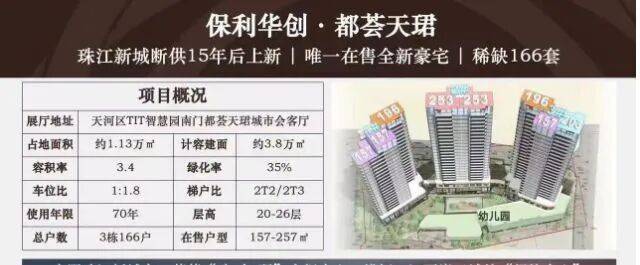 保利华创・都荟天珺坐落于广州市天河区员村一横路 1 号 ,占地面积 11000 平方米,建筑面积达 38000 平方米,容积率为 3.4,绿化率却高达 35%。整个项目规划了 3 栋高层住宅,楼层在 20 至 26 层之间,仅有 166 户,主打 157-257 平方米的大平层户型,定位纯粹高端圈层 。从这些数据不难看出,都荟天珺致力于为业主打造一个低密度、高品质、私密化的居住环境。其车位数为 306 个,车位比达到 1:1.8,充分满足业主的停车需求 。物业费为 8.2 元 /㎡,由专业的物业团队提供贴心服务,为业主的生活保驾护航。