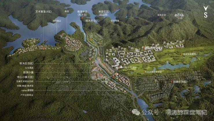 项目重点建设中心小镇C区、艺术聚落F区、伴山美地B区三大园区,并串联现状山地游乐、国王酒店、欧洲小镇与集散中心。