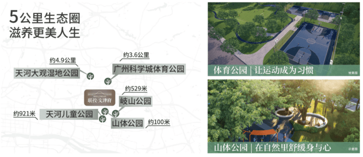 外揽“1+4公园”:山体公园、天河区儿童公园、岐山公园、天河大观湿地公园、广州科学城体育公园。