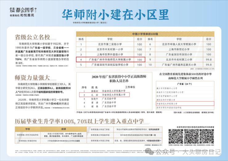自身配套18个班的幼儿园以及引进华南师范大学附属小学(36个班)现在已经开学了,是广东省唯一一所受直属广东省教育厅和华南师范大学双重领导下的省一级学校,被评为“全国百强小学”,多次收到国家级、省部级的表彰及奖励,全校教师均来自于名牌大学,是广州市教学质量最好的小学之一。