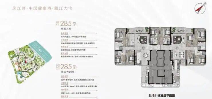 户型:建面约233-285㎡四至五房,东向/东南向一线望江,极致3.4-3.6m层高