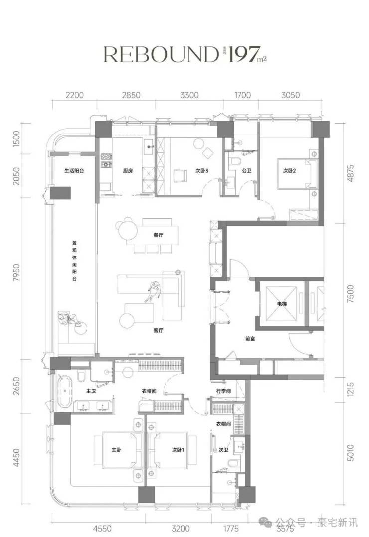 • 尺度革新:建面约197m²户型,专梯入户设计。户型格局极致方正,动静分区清晰,实现了三面采光与双南向套房的“双龙抱珠”格局。