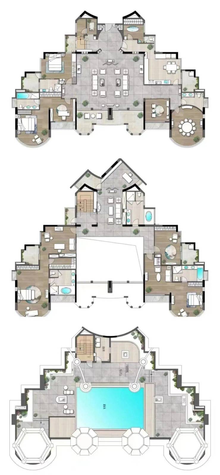 再细看,约458平、467平、564平顶复户型图参考如下,为双层结构,且赠送多一层露天泳池花园,相当于有3层使用空间。