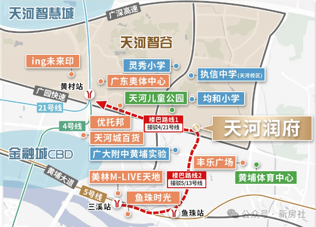 项目紧邻广园快速路,坐享立体交通网络,可快速通达珠江新城、金融城、琶洲三大中央商务区。周边轨道交通便捷,近邻地铁4号线、21号线黄村站,并规划配建公交首末站,进一步强化出行便利性。