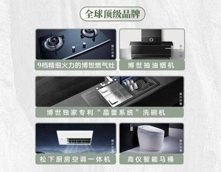 9档火力的博世燃气灶,女主人煎炒烹炸轻松掌握火候;松下厨房空调一体机,告别炎热,让厨房清爽舒适;能彻底洗干净蛋渍的博世独家专利“晶蕾系统”洗碗机,同时清洗16套碗筷,从家务的桎梏中彻底解放;带自动清洗功能的抽油烟机,彻底告别油烟味,此外,还赠送博世冰箱与洗烘一体洗衣机,业主不需再为预留尺寸而烦恼。