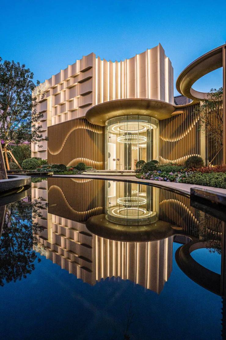 从踏入新世界·天馥销售中心的那一刻起,圆弧形的入庭水景,树影倒映水中,流水潺潺,让人忘忧。