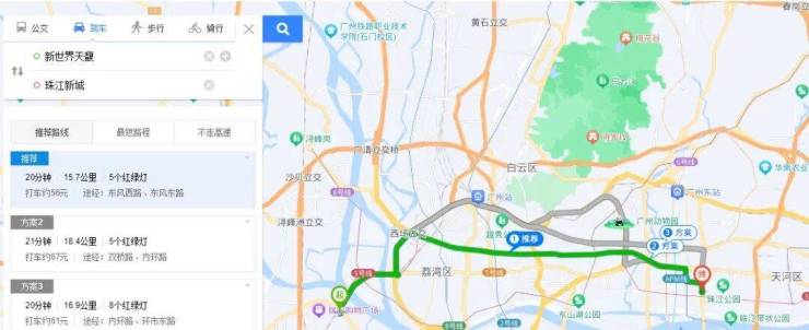 自驾去珠江新城:芳村大道转双桥路,再接内环到东风路,全长15.7公里,不堵车耗时20分钟左右。