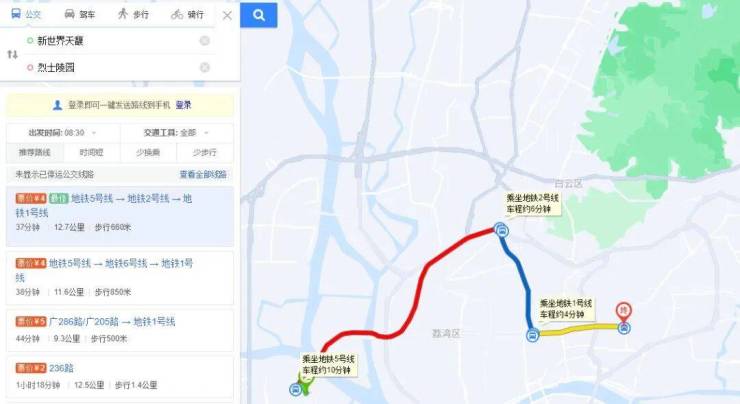 地铁去往省人民/中山大学附属医院:步行至5号线滘口站,到广州火车站换乘2号线,3个站到公园前换乘1号线,2个站到烈士陵园,全程9个站,换乘2次,耗时37分钟。