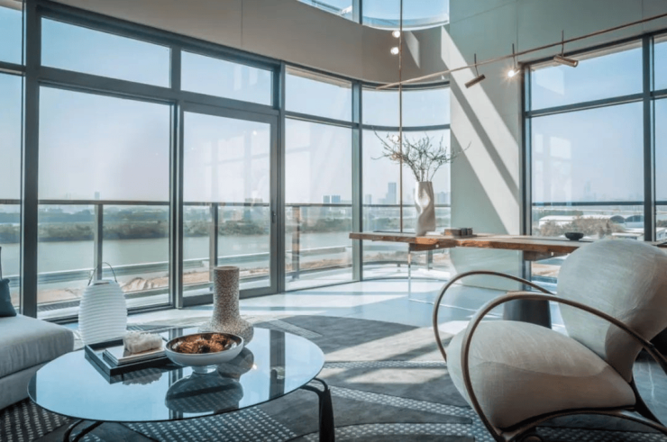项目占据一线临江的稀缺资源,在建筑设计上独具匠心。采用现代商务风格的全玻璃幕墙,整体布局南高北低,通过巧妙的设计,最大化地将一线江景引入视野。阳光透过玻璃幕墙倾洒而入,室内外空间得以自然融合,江景的灵动与建筑的现代感相互映衬。无论是在办公空间内运筹帷幄,还是在居住区域惬意生活,都能随时随地饱览壮阔江景,在繁华都市核心,营造出一处集高端品质与宜人景观于一体的理想之境 。