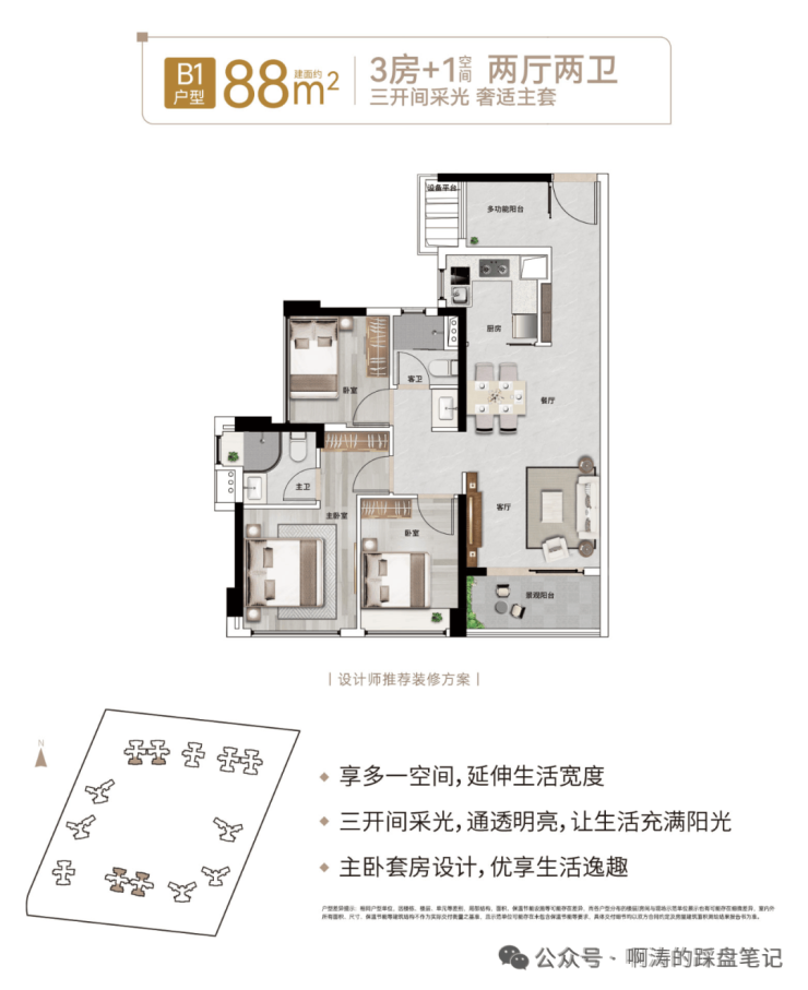 🔅建面约76-88㎡3房+1空间、119-140㎡4房+1空间至五房,同等面积享多一房空间。