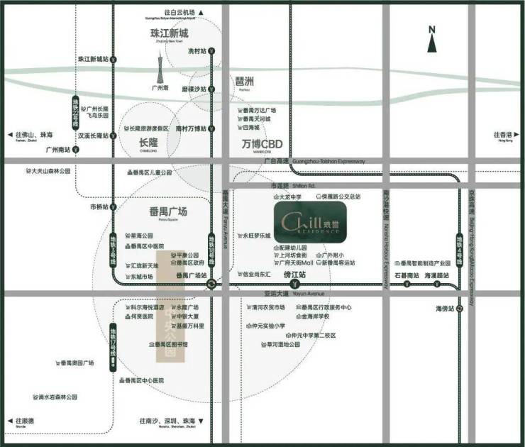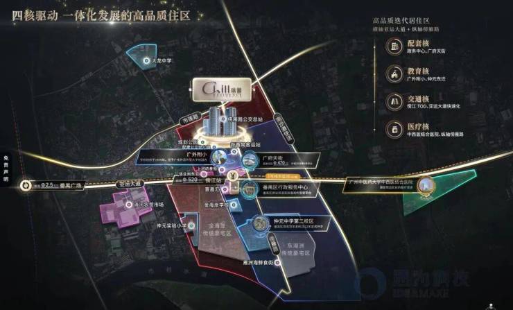 二、中芯 ● 番禺区府新城区府新城板块,旧区府板块的延续和升级版,由配套、教育、交通、医疗四大核心驱动的高品质迭代居住区。