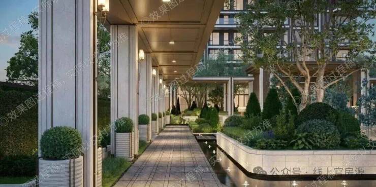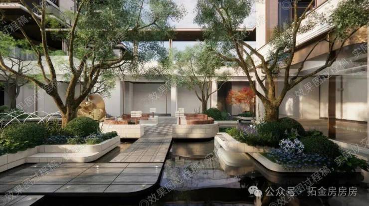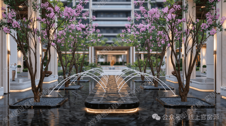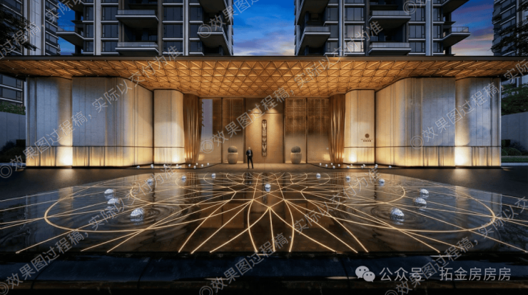 现代简约立面,下沉庭院、景观水池、喷泉广场,诗意园境