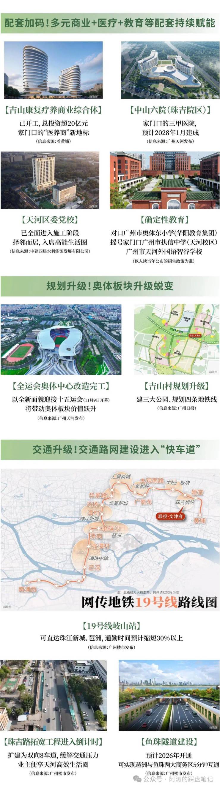 背靠超20万技术人才与八大优势产业,年产值预计达1100亿元,已成为广州第四大经济增长极。天河奥体作为第十五届全运会开幕仪式举办地,政府投入9.7亿焕新天河奥体,以科技赋能全运会,正式体现政府对奥体建设的高度重视;吉山旧改规划敲定,规划4条地铁、三大公园,新增多处学校,周边基础设施城市界面将再次全面升级。联投文津府身处价值暴风眼,将畅享城市升级红利,发展前景稳定且潜力巨大。