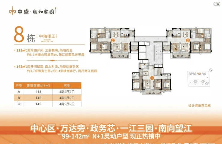 8栋为位于中轴线上,2梯3户坐享江园山三景,独栋两梯三户,超宽楼间距,户型灵动,赠送面积多,南向四开间,南北对流,超6m大开间,瞰江揽园风光无限!
