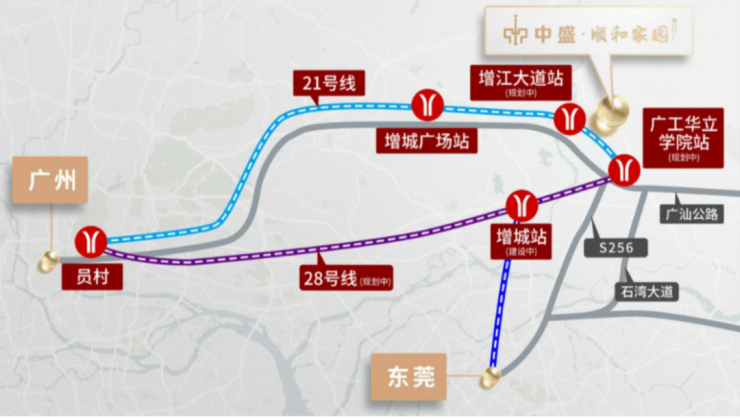 中盛顺和家园位居广州市增城区增江街象山社区广汕公路旁,地处粤港澳大湾区核心区域,广深两大城市圈层之间,环珠江口100公里“黄金内湾”的北部端点,广深港、广珠澳科创走廊重要节点,连接黄埔海丝国际合作先行区,与大湾区重要枢纽东莞隔江相望。