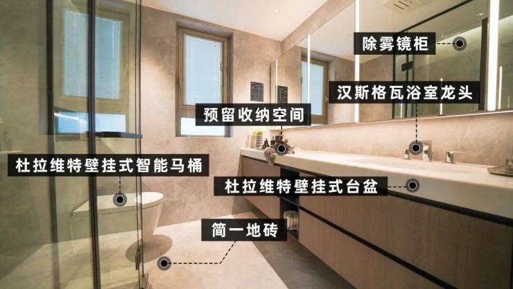卫浴空间使用德国高端品牌汉斯格雅的浴室龙头,杜拉维特壁挂式智能马桶以及台盆。