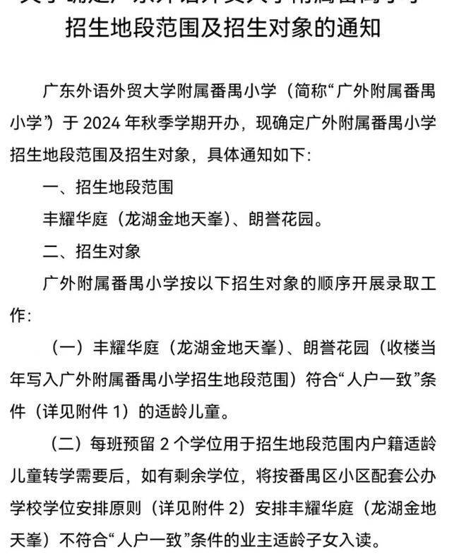 接下来聊聊大家最关心的教育。保利琅誉自身配建了一所9班幼儿园。小学方面,根据2024年教育局发布的番禺区教育划分,该项目已经被划到了龙湖天峯配建的广外附小。这意味着保利琅誉的业主子女可以统筹入读广外附小,再也不用担心要读村小了。