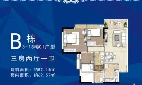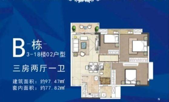 87-98㎡三房两厅一卫 / 两卫户型,分布在 B-1 栋和 C-1 栋,是项目的主力户型。该户型空间布局均衡,客厅开间宽敞,与餐厅相连,营造出开阔的公共活动空间;三个卧室大小适中,可根据家庭需求打造为儿童房、书房或客房,灵活性强。部分户型主卧配备独立卫生间,保障主人隐私;厨房与餐厅相邻,方便食材传递和餐后清洁,整体设计兼顾实用性与舒适度。