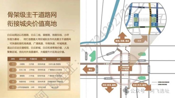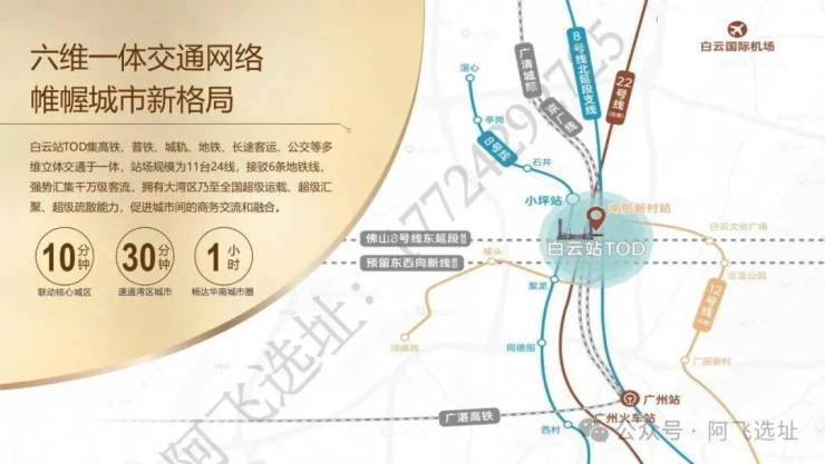 轨道交通方面,项目接驳 6 条地铁线(含 8 号线北延段支线、22 号线、佛山 8 号线东延段及预留新线),30 分钟内可联动广州核心城区,1 小时直达大湾区主要城市。路网配套同样完善,周边石槎路(已开通,双向 6 车道)、白云二线(2023 年底开通,双向 8 车道)、棠槎路(2023 年底开通,双向 8 车道)等主干道路形成 “骨架级路网”,可快速衔接机场高速、广清高速、华南快速等高速线路,直达白云机场、白云新城等城市高价值区域,优化商务通勤效率。