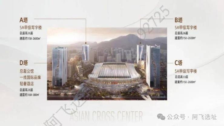 项目写字楼集群包含 A、B、C 三座 5A 甲级写字楼及 D 座总裁公馆(含轻奢酒店),聚焦企业全周期办公需求,在空间、硬件、智能系统上均采用高标准配置。