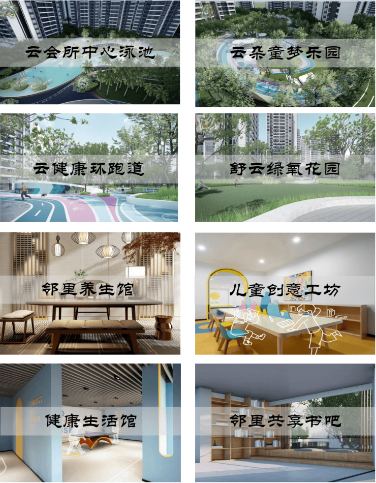 云会所中心泳池(超600㎡,业主刷卡进入)、云朵童梦乐园、舒云绿氧花园、全龄健身区、流云环跑道(约600m)、老年康养花园;