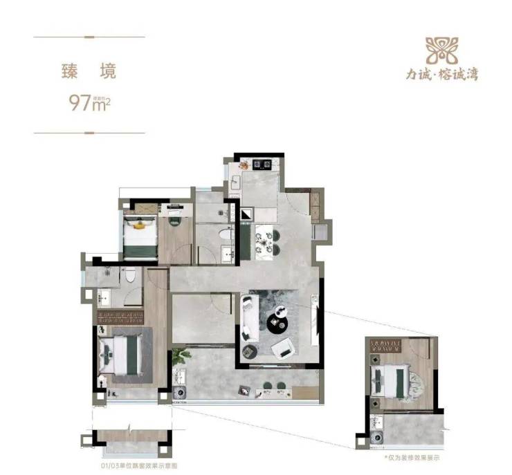 力诚·榕诚湾目前只对外开放建面约97㎡三房的样板间。