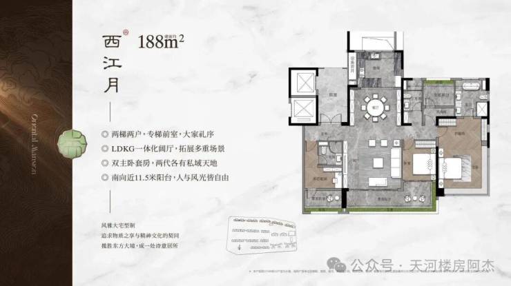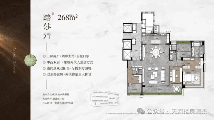 特点:约19米南向面宽、超100㎡聚厅、东西双主卧