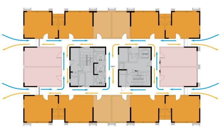 项目摒弃传统单过道,项目采用双环通走廊,极大提升通风采光。