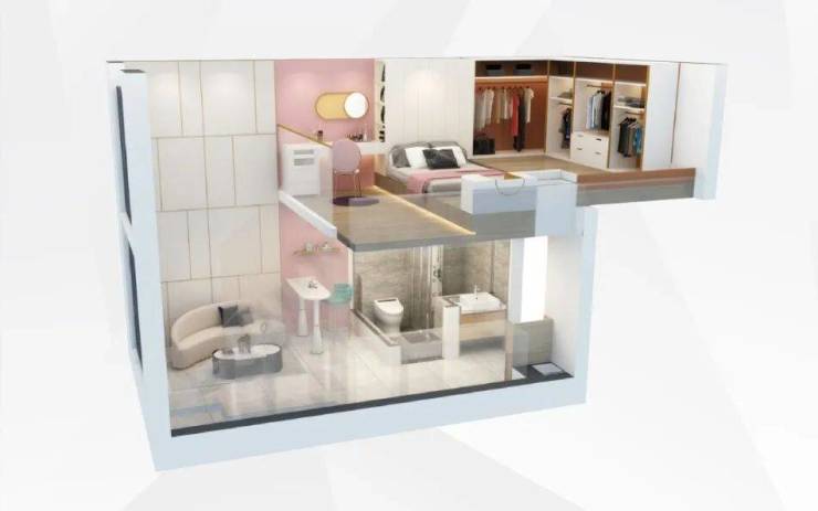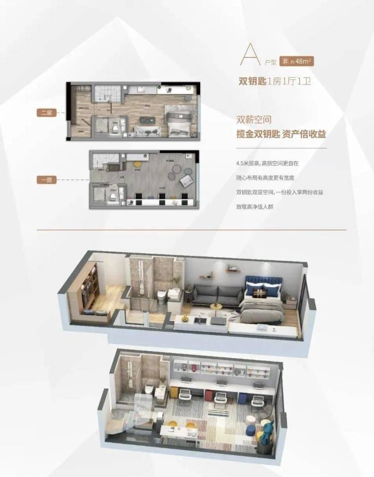 公寓部分规划了3栋21层高楼栋,4梯16户loft设计,共推出288套房源,户型层高4.5米,为精装交付。
