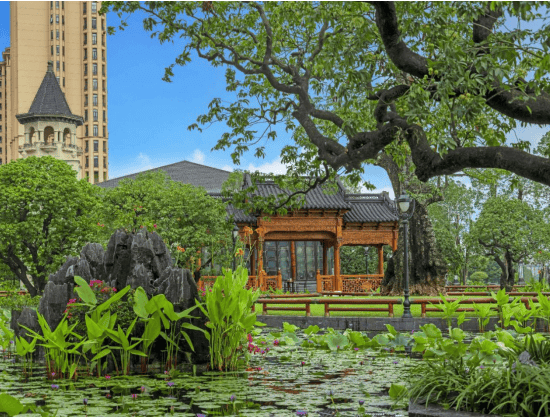 2)大型亲水荷塘 以水为核心,以约 200 多棵高大乔木、约 29 组富贵绿石及英石为主要景观,大量荷花等水生植物作为衬托,园林和建筑融合得美轮美奂