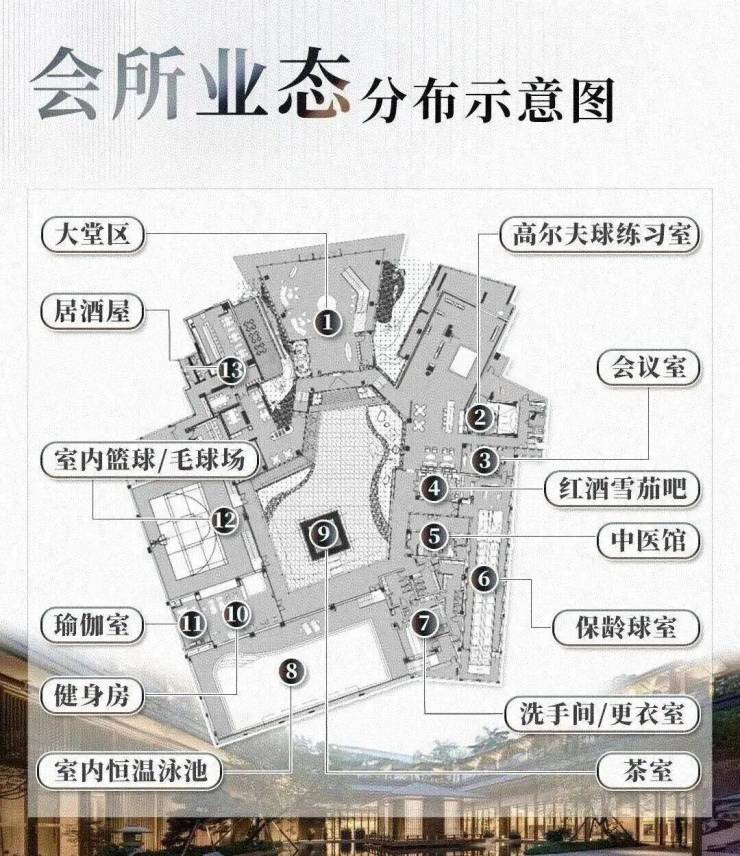 既有常见的恒温泳池、健身房、普拉提室,还有圈层专属配套,比如红酒雪茄吧、保龄球馆、室内篮球羽球混合馆、高尔夫练习室等,基本能满足日常所需。