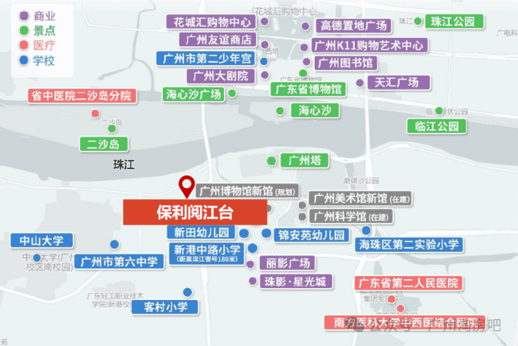 ○ 4大核心商圈:往北-珠江新城CBD、往南-客村商圈、往东-琶洲广州塔国际商圈、往西-海珠西商圈