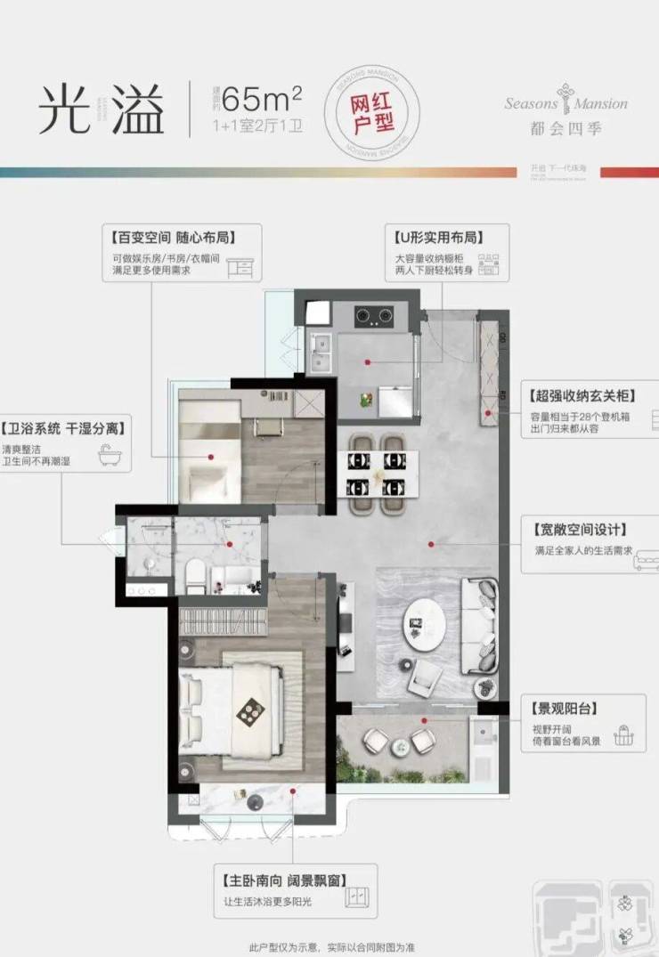 建面约65㎡网红户型,做到1+1房2厅,南向主卧、U型厨房、干湿分离卫生间、约3米宽大开间,功能齐全、尺度阔绰,完全不输市场上约70多㎡的两房单位。