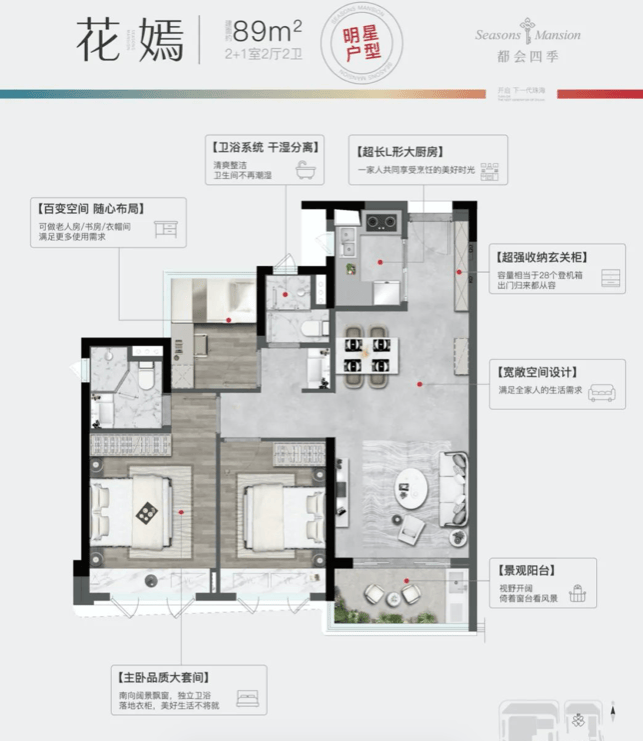 此外,建面约89㎡、99㎡明星三四房,除了功能更完善外,还大面积朝南,不缺阳光不缺清风,舒适度实现最大化。