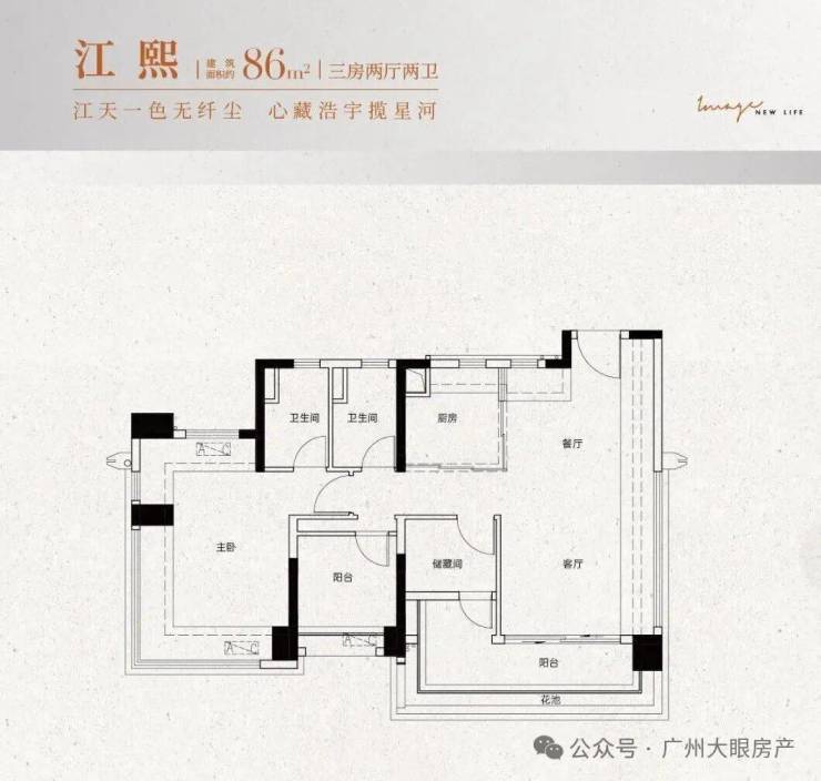 建面约86㎡:三房两厅两卫设计,南向观景大阳台,全屋动静分离,主卧带270°飘窗