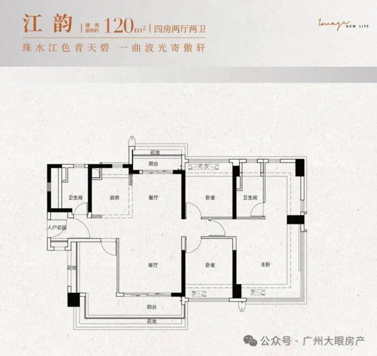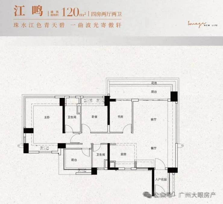 建面约120㎡:四房两厅两卫设计,四开间朝南,居住与生活动静分离,南向大阳台或南北双阳台,主卧带270°飘窗
