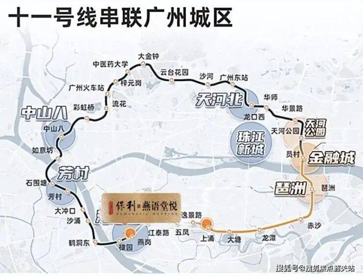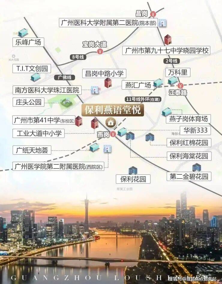 项目位于广佛线+广州地铁11号线-燕岗站地铁上盖,距离地铁 H 出口直线约100米的位置