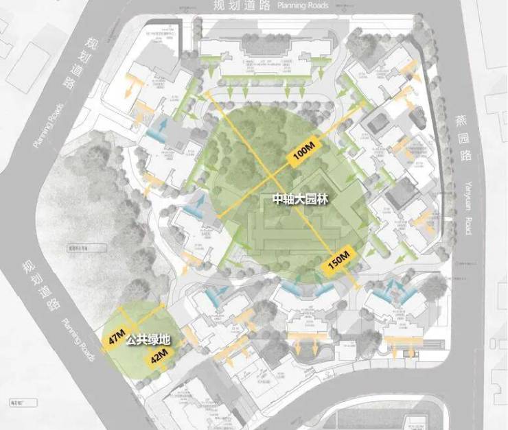 其延续和樾府「一半公园一半城」的基因,以围合式的设计手法,在天河中轴之上,呈现建面约1.5万㎡园林,相当于约150米*100米。