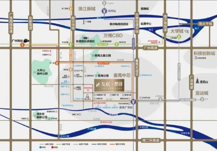 项目距离地铁三号线市桥站约2公里,项目旁边即是公交站(交通大厦站)。番禺内环”之称的南大干线预计 2022 年底全线贯通,快速通达万博、南站等片区。周边还有广台高速、汉溪大道、广明高速。