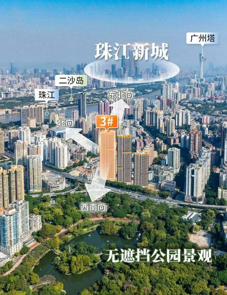 景观升级:东望中大、广州塔;北望二沙岛珠城,西南向直望晓港公园
